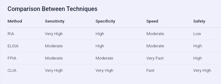 - CLIA stands out as one of the most advanced techniques offering exceptional sensitivity, specificity, and automation capabilities suitable for large-scale clinical diagnostics.